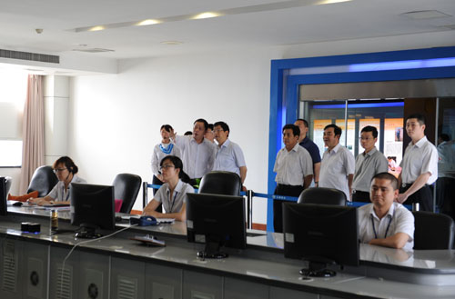 “民以水为天、我以民为先。”沈市长先后视察了肖山水厂、供水服务调度大楼,实地察看了取水口、原水在线实时监测室、集中采样水质监测点、中心控制室、供水服务调度中心。随后在调度大楼13楼会议室听取了沙总关于夏季高峰安全供水准备情况的汇报。