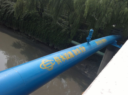 过河钢管是给水管道中常见的管道设施,由于钢管是金属制造,又暴露在外,金属表面防腐层易老化、氧化,因此必须定期实行巡检和养护。为进一步加强和规范过河管的管理,管线所协调力量,在前期巡检的基础上,并按照公司CIS形象识别系统的标准和要求,统一颜色,统一字样,统一标示,对防腐层老化或脱落的过河管进行防腐油漆处理,以有效延长管道的使用寿命,预防漏损等现象的发生,切实保障供水管网的安全运行。