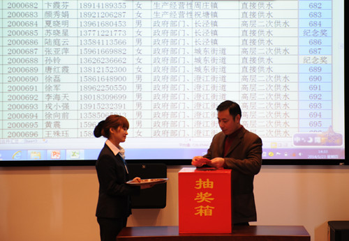 1月23日,在市公证处的全程监督下,公司在13楼阶梯培训中心举行2013-2014年度供水服务满意度调查抽奖仪式,从参与满意度调查活动的用户中共抽出一等奖1名、二等奖5名、三等奖10名、纪念奖200名。