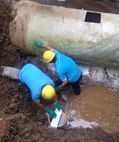 按照“尽快修复,影响范围最小”的要求,抢修人员先用挖掘机开挖至漏水点附近,再采取人工开挖的办法抢修漏水部位。为提速施工进度,争取最短时间恢复通水,现场人员不顾疲劳,站进齐膝深的泥浆中,争分夺秒,轮流作业,硬是用铁锹在管道下方掏出一个修补管道破裂处的作业空间。清洗、切割、打磨、敷玻璃纤维布……抢修工作有条不紊地进行。经过近23个小时的持续奋战,终于在次日凌晨2点30分恢复正常供水,比预计时间整整提前了3个小时。