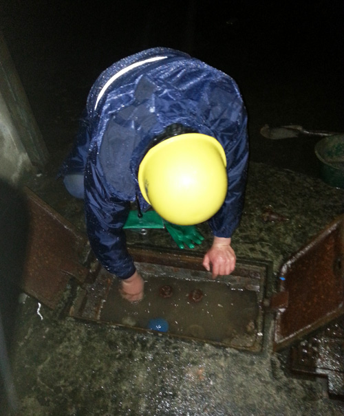 天愈发黑了,寒风夹杂着雨点,像小刀似地刮在人的脸上。大家顶着风雨找到了报修用户的水表总阀,准备关阀抢修。不巧,阀门位置正好位于地面低洼处,已被雨水泥沙堵住了,看不清情况。情况紧急,必须尽快找到阀门。抢修人员跪在地上,脱掉手套,把手伸进冰冷泥泞的表箱中,靠着手的灵敏触感,很快就找到了阀门,关闭它。