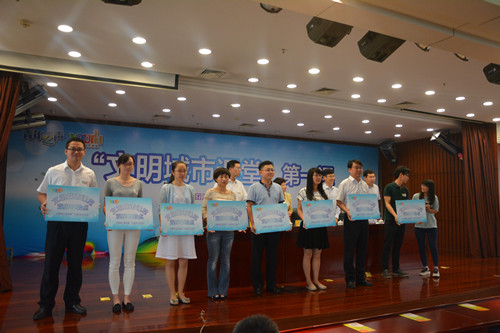 6月7日,江阴市“文明城市课堂”第一课在成人视频 正式开讲,市文明办副主任曹琰、团市委副书记李宁、成人视频 副总经理高立为观摩体验点、授课点授牌,并为首批“文明城市课堂”讲师颁发聘书。