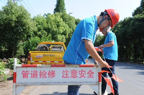 5月26日14点18分,市政工程公司抢修队接到用户的紧急电话:位于云顾路柳工道路机械有限公司附近绿化带内发生爆管。险情就是命令。抢修队接报后快速反应,迅速组织人员、车辆、设备赶赴现场。14点45分,抢修队队长孙燕春、抢修一班和抢修四班相继来到事发地点,勘察现场具体情况,初步确认是路东侧绿化带内DN1000水泥管爆管,由于爆漏情况较为严重,估计将会造成该区大面积停水,结合现场情况,抢修人员一边在爆管现场周边进行安全围挡,一边迅速进行关阀止水,同时着手对外发布停水信息,并准备向停水区域送水,抢修工作紧张有序地进行。